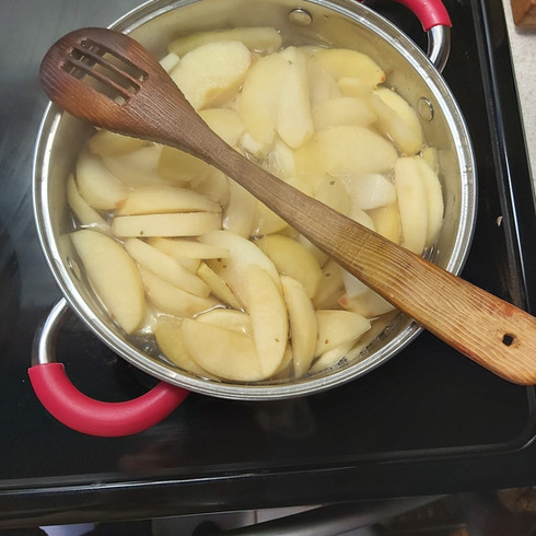 7. Once you have the apples cut, throw them in the simmering pot and allow for them to cook down.